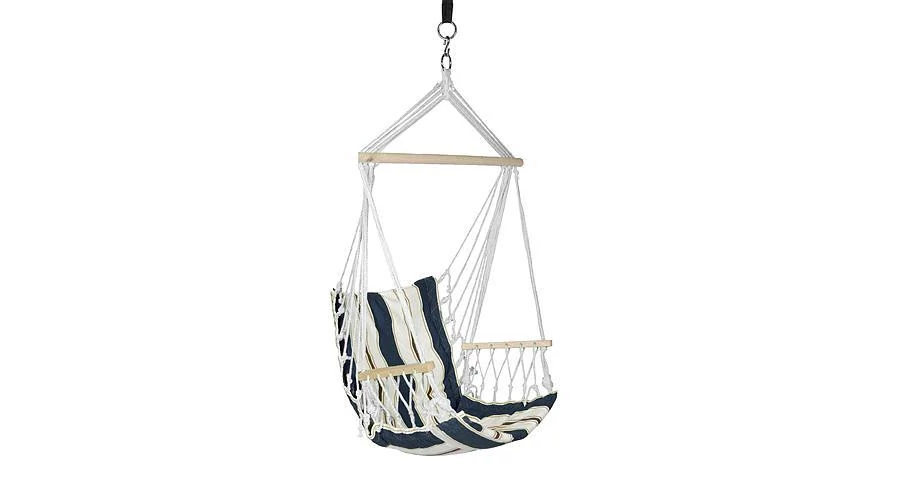 A kék, pamut, függőszék kültérben és beltérben is használható. Egy előre felszerelt kampóra függessze fel. Teherbírása 150 kg, méretei 100 x 50 cm. A pamut ülőrész fával van kitámasztva a nagyobb biztonságért és kényelemért.