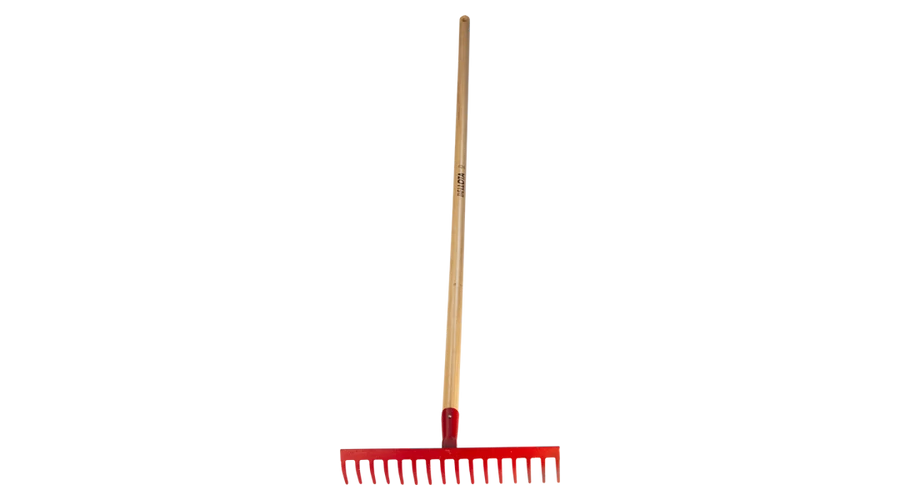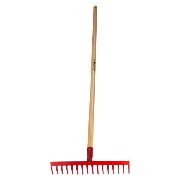 Nagy szilárdságú, szénacél gereblye fej, 16 foggal. 150 cm-es lakkozott nyéllel.