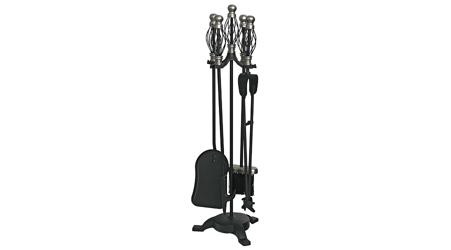 - Tartalmaz egy állványt, egy kefét, fogót, egy lapátot és egy piszkavasat