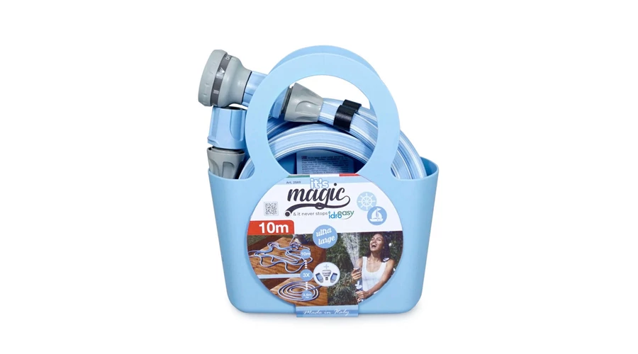 •Tartalma: Magic Soft Nagy pasztellkék szín és fehér csíkok (Új anyag, amely garantálja az ivóvízhez való felhasználást), 2 gyorscsatlakozó, 6 funkciós fúvóka és tömlőtartó.