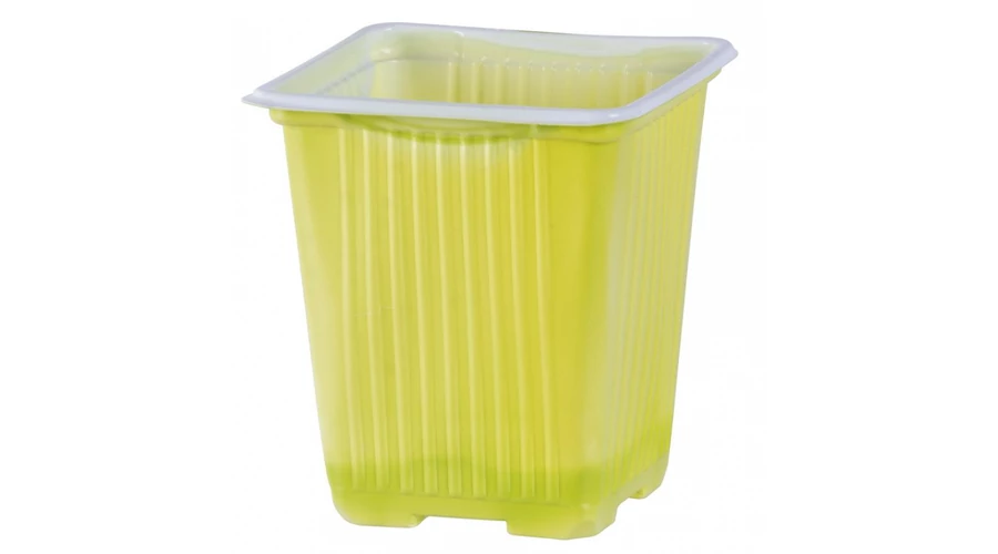 Műanyag szögletes virágcserép palántákhoz. A palánták eltávolítása egyszerű a könnyű műanyagnak köszönhetően.