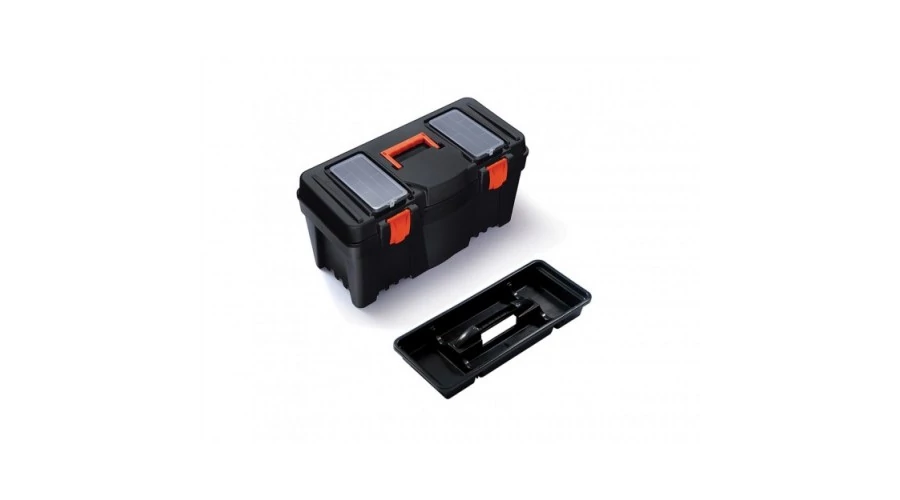 Szerszámosláda, kéziszerszámok tárolására. Dupla csattal, két külső tárolóval.