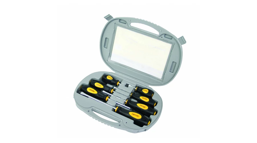 7 db-os készlet műanyag tartóban Cr-V acél, mágneses hegy és két komponensű fogantyú 3 db Phillips: PH2x38mm, PH1x75mm, PH2x100mm 4 db lapos: 6x38, 4x75, 6x100, 8x150 mm